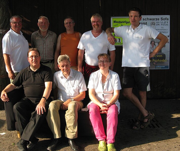 Beim Mostheurigen Scheibenreif in Flatz trat am 20. Juli der neue Ortsbauernrat erstmals öffentlich auf und nahm auch gleich am schwarzen Sofa Platz. Vorne sitzend: Ortspfarrer Dechant Ringel, er gab seinen geistlichen Segen, LAbg. Hermann Hauer, Schriftführerin Brigitte Ulreich. Stehend von links: GR Karl Pölzelbauer, GR a.D. Anton Scheibenreif, Ortsbauernratsobm. Stv. Anton Scheibenreif, Obm. Stv. Horst Ulreich und Ortsbauernratsobmann Lorenz Scheibenreif.