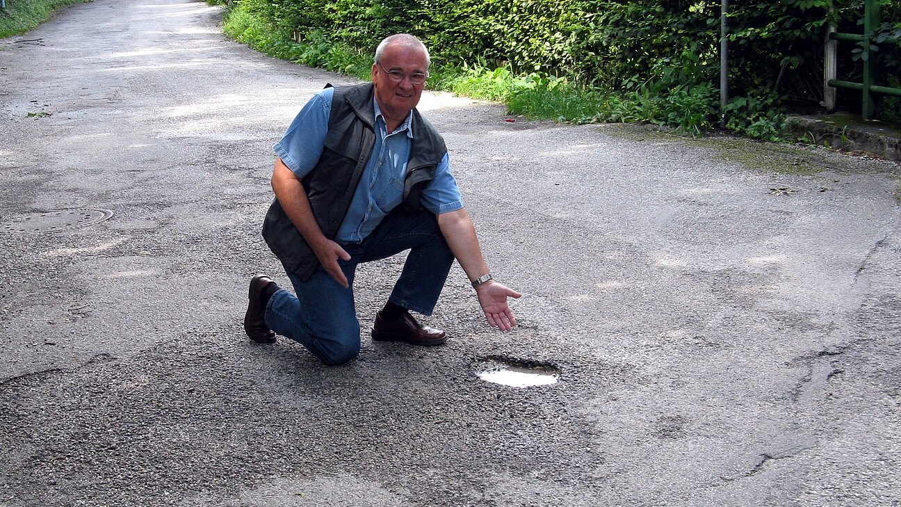 ÖVP-Vize Karl Pölzelbauer verweist auf die zahlreichen Schlaglöcher der Pottschacher Altstraße. Viele Bürger sind wegen dem schlechten Zustand der Straßen in der Stadtgemeinde verärgert.